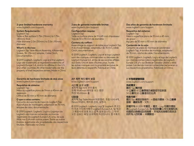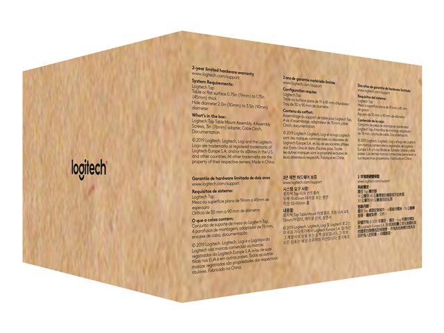 Specifications Product Description Logitech Tap Table Mount - video conferencing controller mounting kit Product Type Video conferencing controller mounting kit Package Content Mounting hardware Dimensions (WxDxH) 24.4 cm x 17.9 cm x 6.1 cm Features 180° rotation, for 20-50 mm table, 51-89 mm diameter hole Manufacturer Warranty 2-year warranty Designed For Room Solution Base Bundle, Huddle, Large; Tap - Extended specifications