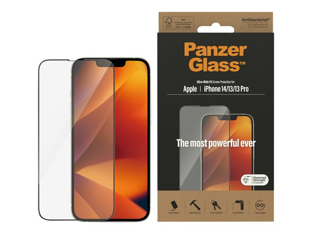 Specifications Product Description PanzerGlass - screen protector for mobile phone - ultra-wide fit Product Type Screen protector - glass Intended For Mobile phone Protection Scratch-resistant, antibacterial, shock-resistant, fingerprint-resistant Product Material Polyethylene terephthalate (PET) Dimensions (WxDxH) 6.76 cm 14.294 cm Thickness 0.61 mm Weight 21 g Frame Colour Black Designed For Apple iPhone 13, 13 Pro, 14 - Extended specifications
