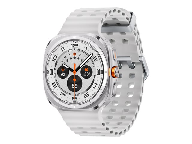 Specifications Product Description Samsung Galaxy Watch Ultra - titanium - smart watch with marine band - white - 32 GB - titanium white Product Type Smart watch Manufacturer Model Number SM-L705F Activity / Sport Running, swimming, cycling, hiking, climbing, mountain climbing, triathlon, open water swimming, elliptical, rower, mountain biking Tracking Data Distance, calories burned, activity, sleep activity, heart rate, steps taken, floors climbed, skin temperature, blood oxygen saturation, sleep stages, stress level, body composition, active time, blood pressure, snoring, ECG, sleep quality score, stride length, female health management, functional thresold power (FTP) Connectivity Wi-Fi, LTE, NFC, Bluetooth 4G Navigation GPS/GLONASS/Galileo/BeiDou receiver Display Super AMOLED - 1.5" - 480 x 480 pixels - 327 ppi - always-on display Processor Samsung Exynos W1000 Storage 32 GB Operating System Wear OS by Samsung Case Rounded square - 47 mm - titanium Band White - marine band - rubber - size: S/M/L - changeable Platform SmartThings Intelligent Assistant Google Assistant, Bixby Input Touch screen, push buttons, rotating crown, double tap gesture Notifications Calendar, SMS, social apps, incoming calls, irregular rhythm Features Camera remote control, find phone function, VO2 max, Fall detection, Emergency SOS, music playback control, personalised coaching, heart rate zones, trackback routing, Route guidance, Samsung Smart Switch, Siren (86-decibel), fast charge, brightness: 3000 nits, Galaxy AI, GPX routing Supported Host Device OS Android Battery Rechargeable 590 mAh - WPC Battery Run Time Up to 100 hours Colour Titanium white Dimensions (WxDxH) 47.1 mm x 12.1 mm x 47.4 mm Weight 60.5 g Specific Absorption Rate (SAR) 0.113 W/kg (head)