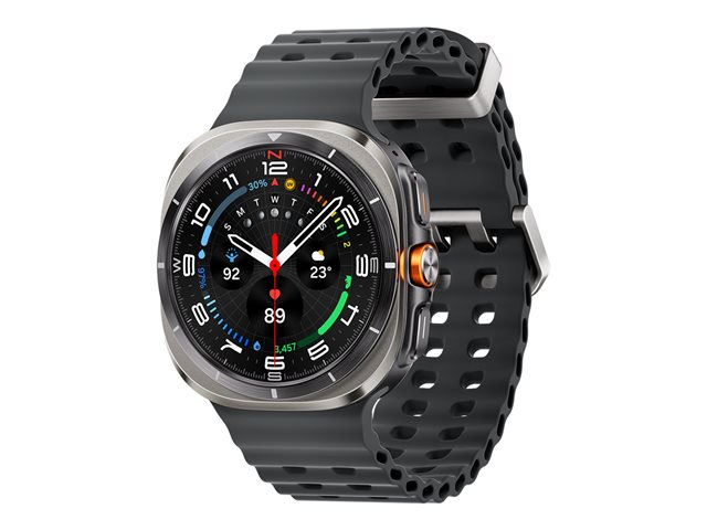 Specifications Product Description Samsung Galaxy Watch Ultra - titanium - smart watch with marine band - dark grey - 32 GB - titanium silver Product Type Smart watch Manufacturer Model Number SM-L705F Activity / Sport Running, swimming, cycling, hiking, climbing, mountain climbing, triathlon, open water swimming, elliptical, rower, mountain biking Tracking Data Distance, calories burned, activity, sleep activity, heart rate, steps taken, floors climbed, skin temperature, blood oxygen saturation, sleep stages, stress level, body composition, active time, blood pressure, snoring, ECG, sleep quality score, stride length, female health management, functional thresold power (FTP) Connectivity Wi-Fi, LTE, NFC, Bluetooth 4G Navigation GPS/GLONASS/Galileo/BeiDou receiver Display Super AMOLED - 1.5" - 480 x 480 pixels - 327 ppi - always-on display Processor Samsung Exynos W1000 Storage 32 GB Operating System Wear OS by Samsung Case Rounded square - 47 mm - titanium Band Dark grey - marine band - rubber - size: S/M/L - changeable Platform SmartThings Intelligent Assistant Google Assistant, Bixby Input Touch screen, push buttons, rotating crown, double tap gesture Notifications Calendar, SMS, social apps, incoming calls, irregular rhythm Features Camera remote control, find phone function, VO2 max, Fall detection, Emergency SOS, music playback control, personalised coaching, heart rate zones, trackback routing, Route guidance, Samsung Smart Switch, Siren (86-decibel), fast charge, brightness: 3000 nits, Galaxy AI, GPX routing Supported Host Device OS Android Battery Rechargeable 590 mAh - WPC Battery Run Time Up to 100 hours Colour Titanium silver Dimensions (WxDxH) 47.1 mm x 12.1 mm x 47.4 mm Weight 60.5 g Specific Absorption Rate (SAR) 0.113 W/kg (head)
